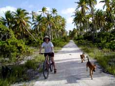 自転車に乗って、隣り村までサイクリング。 マウリパラダイスに住むキリバス犬のレオとキンが一緒についてきてくれました。