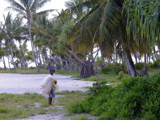 ![]() 網を担いで漁に出るのは日課。いつも大漁とは限らないが、新鮮な魚が毎日食べられる |