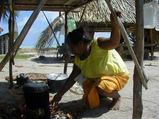 ![]() 炊事場。燃料はヤシの実の皮、香りがうつって旨さが増す |