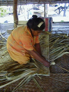![]() パンダナスの葉は寝具のマットにも加工される。編み始めるまでの葉の加工が大変 |