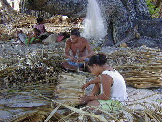 ![]() 屋根材は街に運ばれ、現金収入が得られます。 刺のあるパンダナスの葉を扱う大変な仕事です |