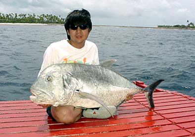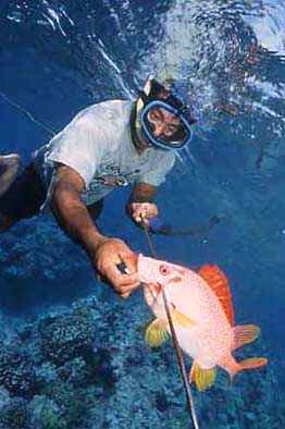 太平洋、赤道直下の豊かな水中世界 漁師は伝統的なカヌーで漁に出ます。魚がかかると、帆を動かすロープを足の指にはさみ、カヌーを操ります。 両手でラインを引き、ひとひろ以上もあるキハダマグロやカジキマグロ、ロウニンアジをあげます。 一本のモリを手に水中マスクだけで潜る漁も日常的に行われています。 |